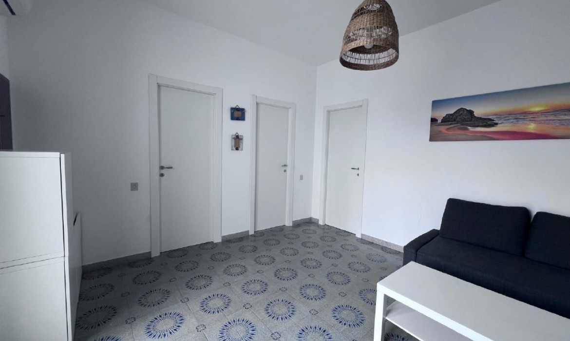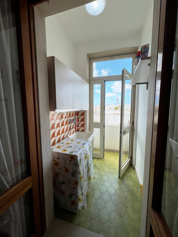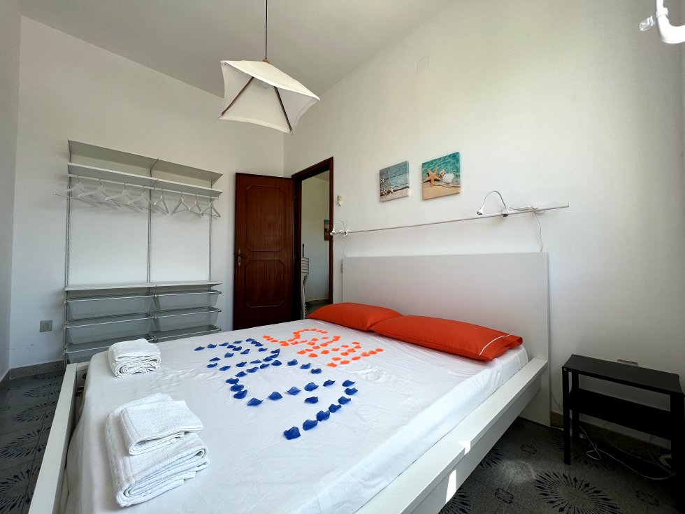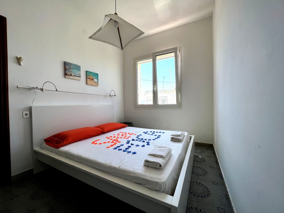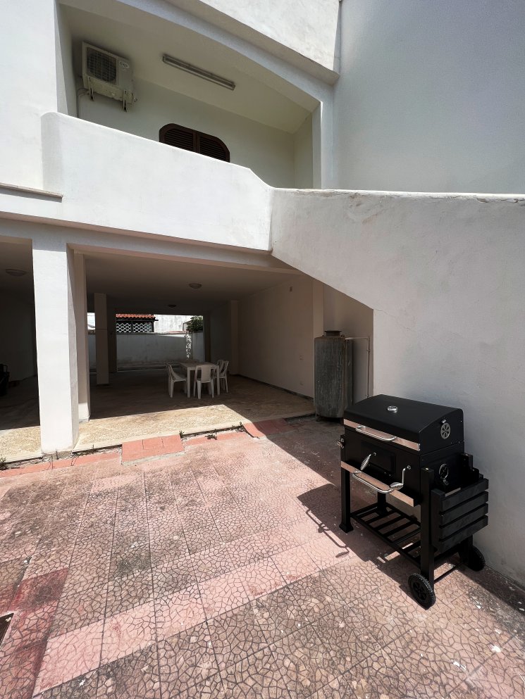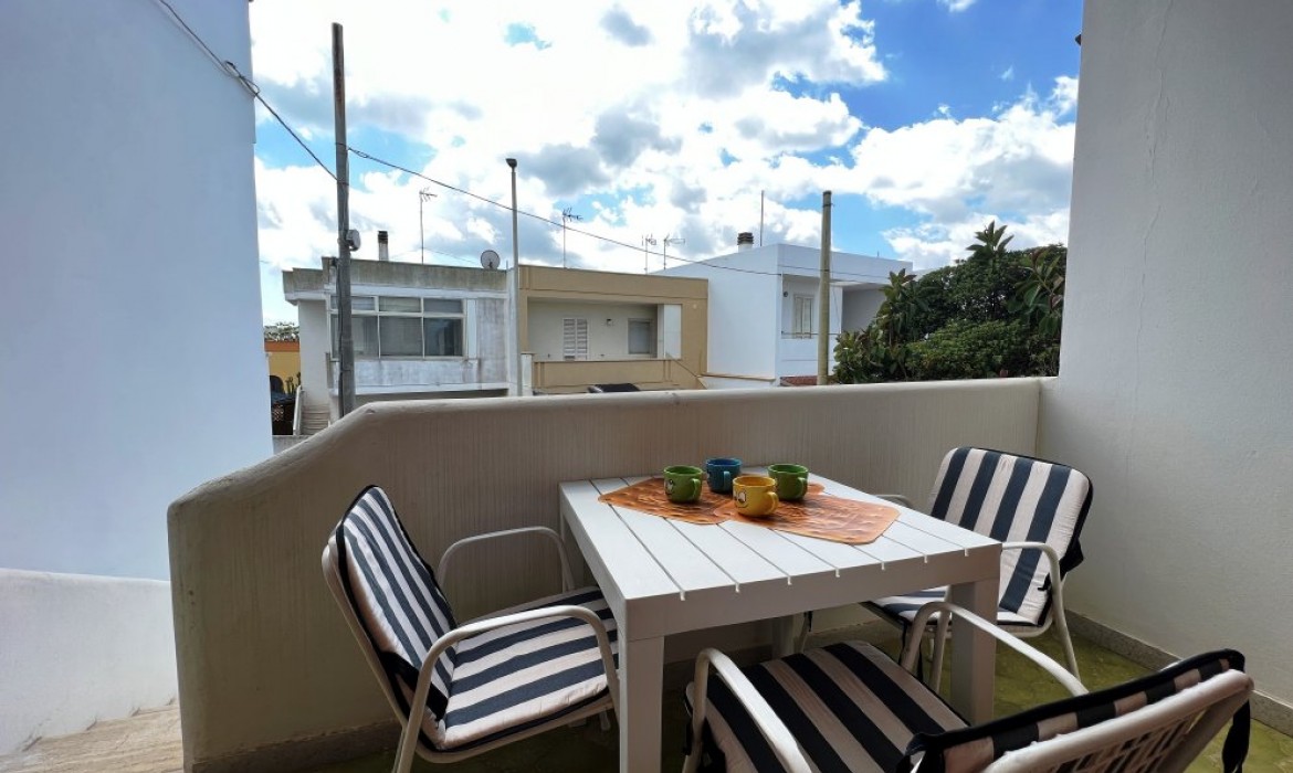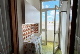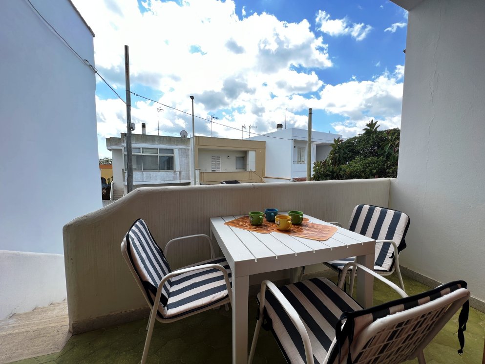 Appartamento nella Marina di San Foca a Primo Piano ed ultimo con balconcino avanti e veranda grande a piano terra attrezzata con tavolo sedie e barbecue, posto auto interno. Dista dalla spiaggia di sabbia appena 270 m. La soluzione vacanza proposta in locazione, si compone da: Piano terra con ingresso posto auto, veranda coperta e scoperta grande attrezzata con tavolo e sedie in plastica e barbecue  per pranzare e cenare all'aperto, doccia esterna solo acqua fredda, scale per l'accesso al piano primo; al Piano Primo troviamo un balconcino con tavolino per le colazioni, ingresso-soggiorno open-space con divano letto matrimoniale e tavolino e tv color lcd 32 pollici, tinello-cucina completo di cucina componibile e tavolo con sedie, frigo con congelatore, lavanderia a parte con pilozza e lavatrice, disimpegno notte e giorno dove troviamo 2 camere da letto matrimoniali, entrambe complete di armadi e comodini, bagno completo con box doccia. Balcone anteriore per trascorrere piacevoli momenti in relax respirando la meravigliosa aria fresca di San Foca. Posti letto 4/5/6. Climatizzato nel soggiorno e in una sola camera da letto. Dista dalla spiaggia libera e o attrezzata appena 270 m. Accessori presenti: lavatrice, aria condizionata, ferro da stiro con asse, phon, frigo con congelatore, forno, autoclave con serbatoio, tv color lcd 32", barbecue, piastra elettrica per arrosti. Arredato Nuovo e con infissi a taglio termico. Stoviglie complete. Zanzariere presenti.  CIN:  IT075043C200059557