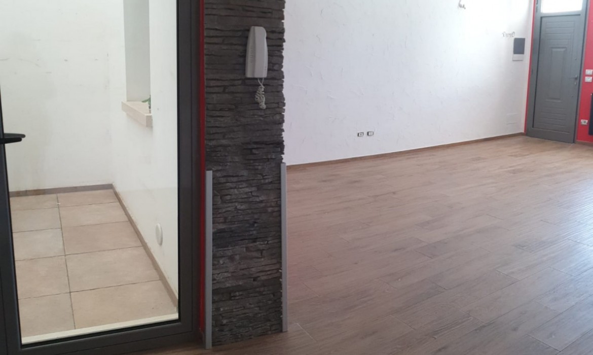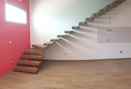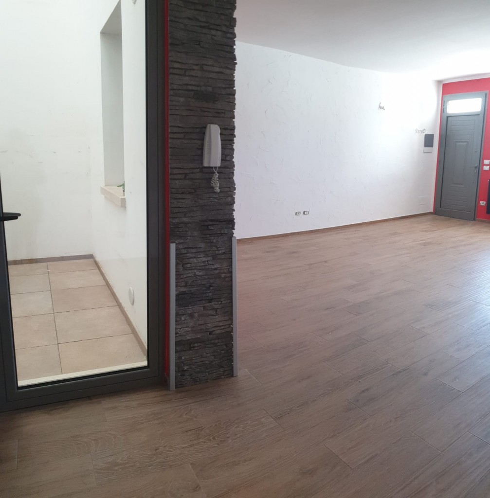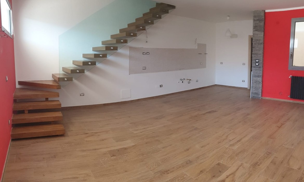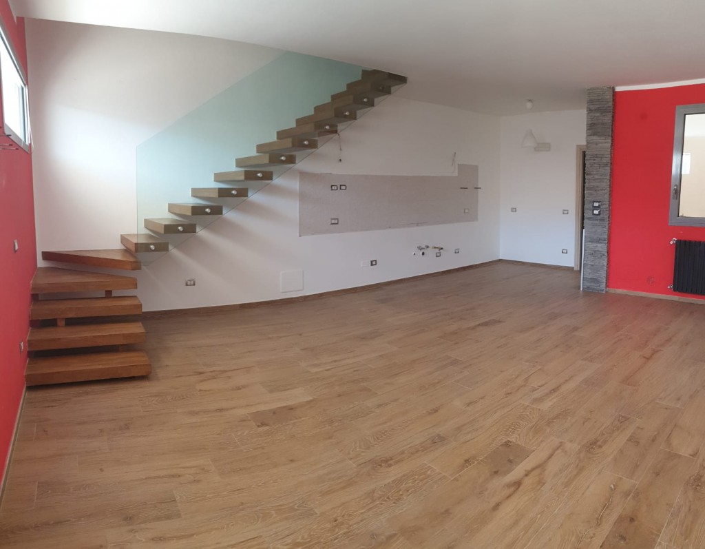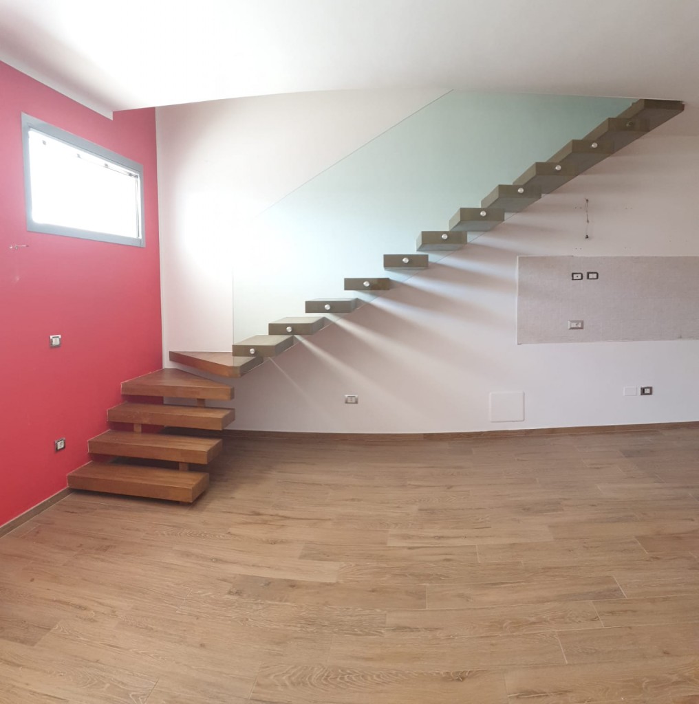 Piano Terra, con ulteriore accesso dalla tavernetta mediante scaletta in legno retrostante l'abitazione coperta, verandina privata con ingresso da fronte strada, grande spazio open-space con scala del tipo a gradini fluttuanti e corrimano in cristallo, bagno completo con doccia, e piccolo scoperto con lavanderia dove è collocata la scala per andare in tavernetta.